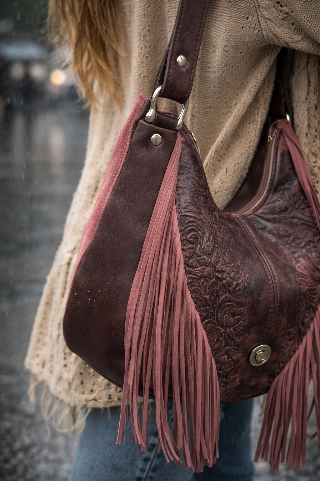 Embossed leather and flowing fringe come together in Purple Rain with a design that feels moody, romantic, and effortlessly expressive.